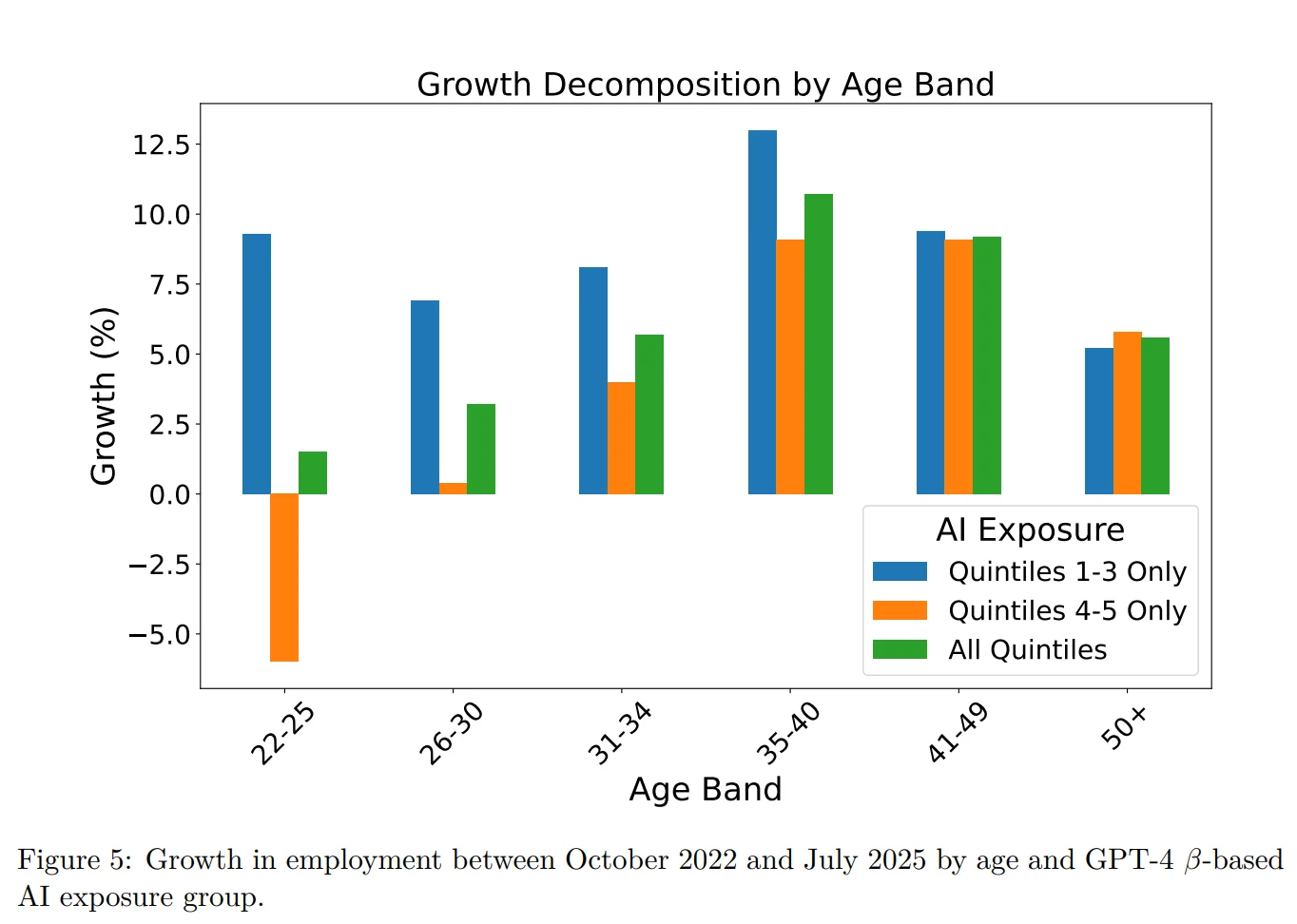 Here’s a study by Brynjolfsson et al. (2025) showing how AI is affecting young workers with jobs highly exposed to AI. Paradoxically, other cohorts with jobs exposed to AI have not been affected.