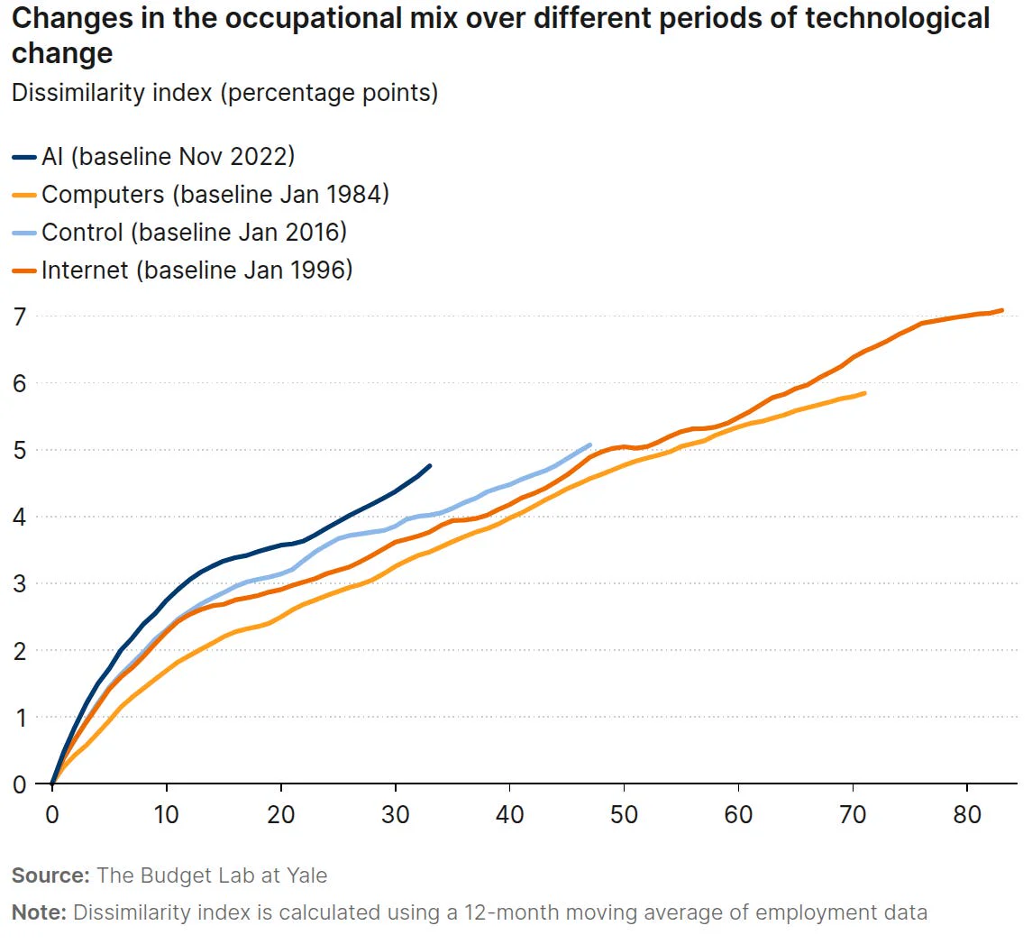 One can reasonably say that these benchmark charts are useless and that what ultimately matters is whether AI is actually eliminating jobs. On that question, the data is contradictory. For example, here’s data from a recent study by Brookings and Yale Budget Lab on how AI has affected the labor market in the US: