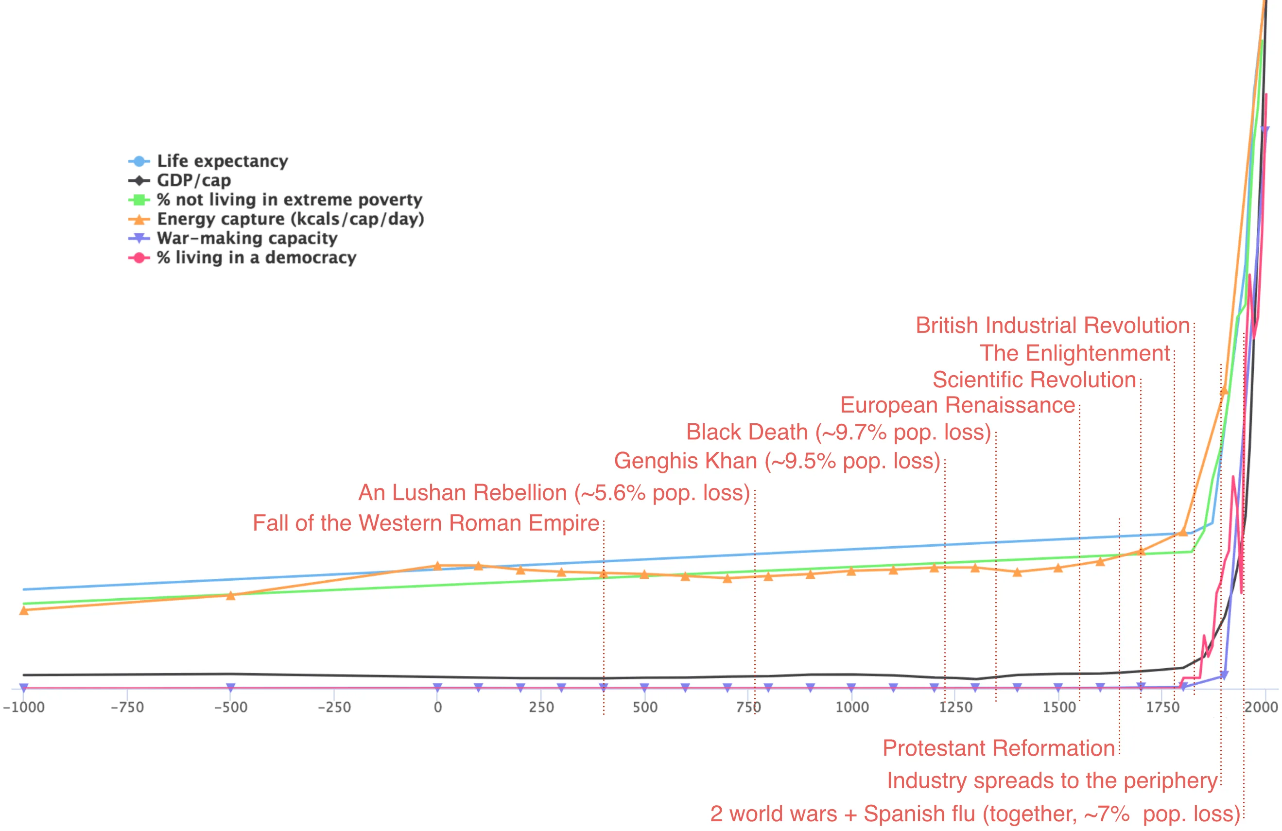 The short descriptions of these famous men are fascinating given that I know next to nothing about the industrial revolution except for the fact that I knew the industrial revolution happened thanks to my relentless mugging of social studies textbooks in school. The two industrial revolutions starting from the late 1700s to the early 1900s pushed humanity from an age of scarcity to abundance. This chart by Luke Muehlhauser illustrates the profound impact of the industrial revolution.