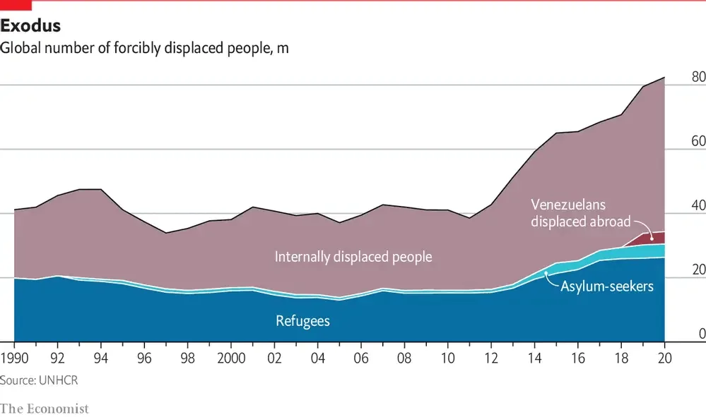 People from just five countries account for about half of those displaced abroad (see chart). The biggest share have left Syria, where the civil war which began in 2011 has settled into a bloody stalemate. Almost 5m Venezuelans have escaped an economic crisis and political repression in their home country. Afghans subject to terrorism and insurgency, and South Sudanese caught in the middle of fighting have also fled their homes. In Myanmar, more than 1m people have escaped civil war and the genocide of the Rohingyas.