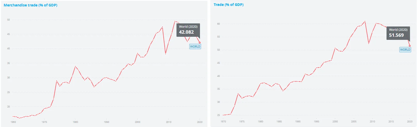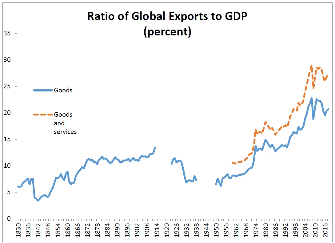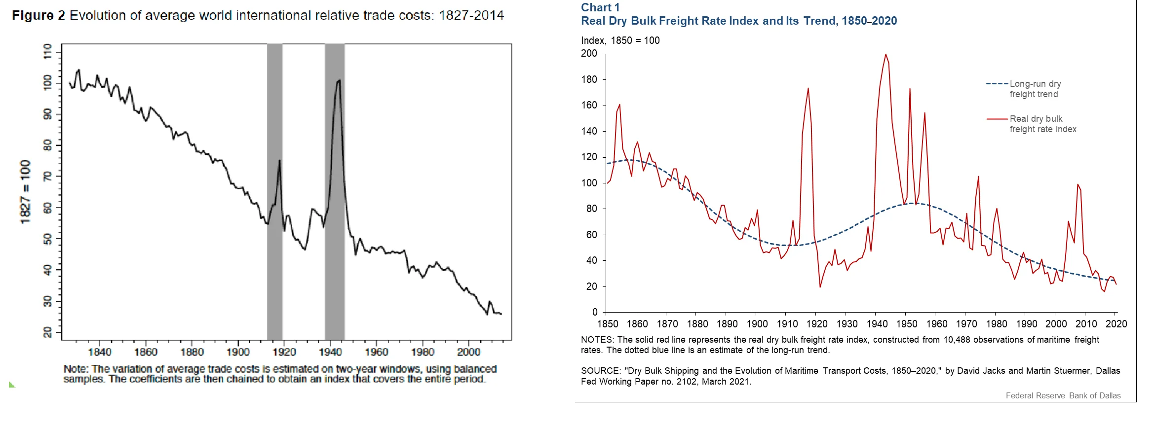 Trade cost is a broad measure that includes everything from tariffs, freight, and communication to distribution costs. 20% of the fall in trade costs came after 1960. The 2nd image shows the cost of shipping dry bulk such as oil, coal, and ore. It’s been on a steady downtrend since 1850-60. You can extrapolate that to container costs.