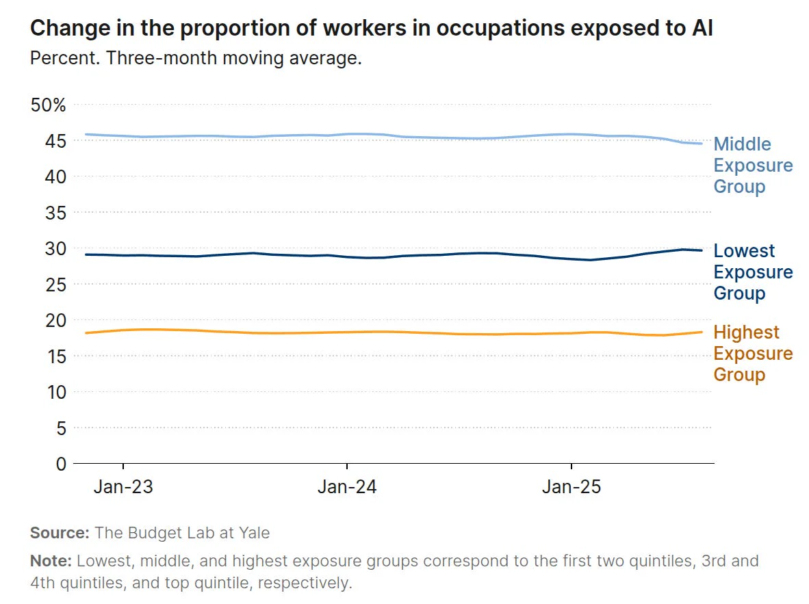 One can reasonably say that these benchmark charts are useless and that what ultimately matters is whether AI is actually eliminating jobs. On that question, the data is contradictory. For example, here’s data from a recent study by Brookings and Yale Budget Lab on how AI has affected the labor market in the US: